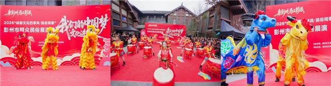 大年初一,新春的钟声悠然敲响,彭州市百里一·龙兴集张灯结彩,处处洋溢着热闹喜庆的氛围。由彭州市文化广电体育和旅游局主办、彭州市文化馆承办的2026年“成都文化四季风·民俗闹春”群众民俗展演活动在此盛大启幕,数千市民与游客齐聚一堂,共赴这场新春文化之约。